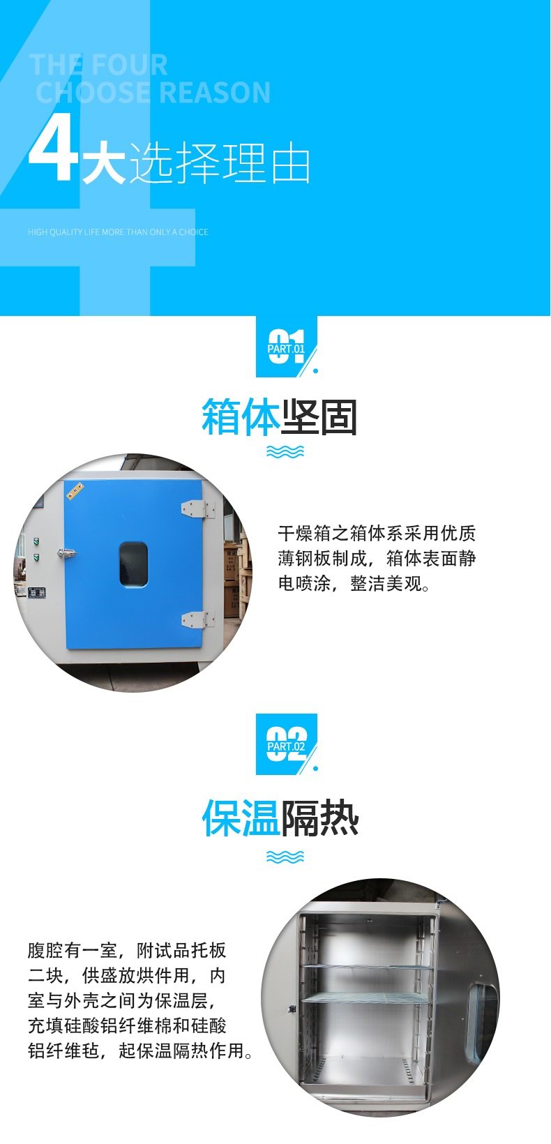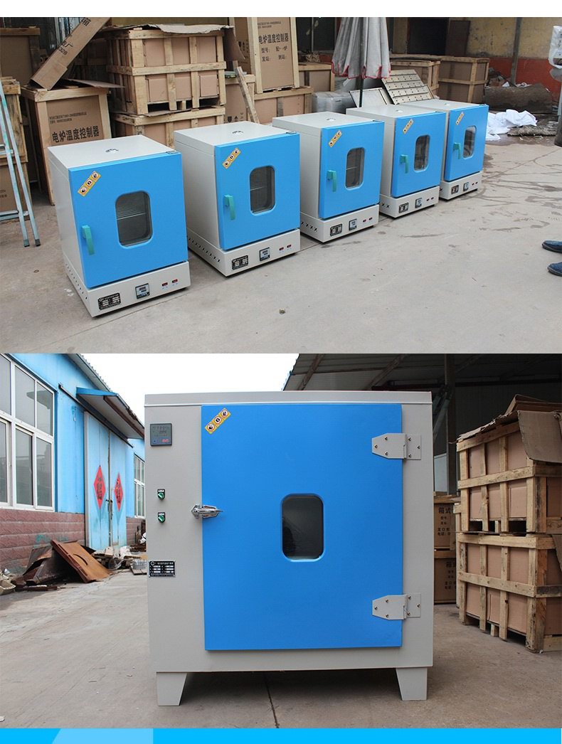 干燥箱之箱體系采用優質薄鋼板制成。腹腔有一室,附試品托板二塊,供盛放烘件用,內室與外殼之間為保溫層,充填硅酸鋁纖維棉和硅酸鋁纖維氈,起保溫隔熱作用,箱體表面靜電噴涂,整潔美觀。本干燥箱裝有一道門,采用鋼化玻璃門,便于觀察試品的情況。外門為薄鋼板制成。外門夾層裝有硅酸鋁纖維棉及氈,門邊緣壓裝有石棉繩,加以絕熱,防止溫度外逸。    本箱以電熱絲加熱,電熱器裝于室內底部,控溫儀及電器接線及電動鼓風機均于箱左側空間內,左側門可以啟卸,便于檢修和調換零件。